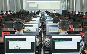 剛一進(jìn)門,記者就聽到槍炮聲、戰(zhàn)車轟鳴聲交織在一起。百余名官兵頭戴耳機(jī)端坐在電腦前緊張操控著鼠標(biāo)和鍵盤,前方大屏幕上顯示“紅軍”裝甲戰(zhàn)車正快速通過“藍(lán)軍”炮火攔阻區(qū)。