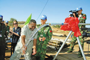 蘇丹是一個極度缺水的國家,常年動亂的一個重要原因就是爭奪水源。西方地質(zhì)學(xué)家勘測后曾認定北部達爾富爾地區(qū)無地下水。北京軍區(qū)給水團維和官兵的主要任務(wù)是在這里進行水源勘察并構(gòu)筑供水井,解決達爾富爾地區(qū)維和部隊及維和警察生活保障用水。去年10月16日上午,一股清泉從火成巖中噴涌而出,標志著我給水團官兵開創(chuàng)了聯(lián)合國維和部隊用水自給的先河,同時也書寫了我軍工兵首次在國外找水打井成功的歷史。
