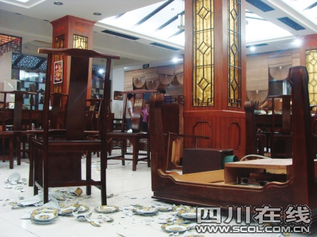 洪雅縣招商局局長(zhǎng)冷國(guó)民,帶著10余位親朋好友,也在該店“青衣江”包間內(nèi)用餐。飯后結(jié)賬時(shí),冷國(guó)民一行與收銀員在簽單上出現(xiàn)分歧,隨之發(fā)生口角。當(dāng)冷國(guó)民讓司機(jī)現(xiàn)金結(jié)清賬單后,其所帶男性客人在趕來“救場(chǎng)”的3名男子的帶領(lǐng)下,砸爛店內(nèi)桌椅、碗碟等,打傷兩名店員。