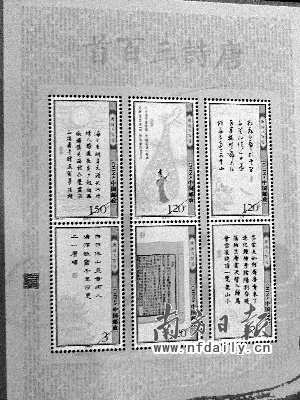 昨日省郵政公司表示,為慶祝共和國成立60周年,弘揚(yáng)中國傳統(tǒng)文化,中國郵政將于本月13日發(fā)行“世界上首套多媒體郵票”———《唐詩三百首》(見左圖,楊小亮攝)。此套郵票一套共6枚,全套面值9元。