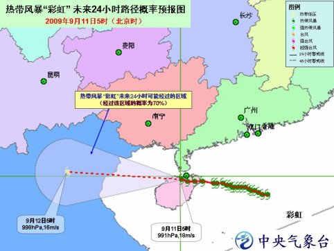 中新網(wǎng)9月11日電 中央氣象臺今日6時發(fā)布臺風(fēng)預(yù)報:今年第13號熱帶風(fēng)暴“彩虹”今日凌晨已經(jīng)在海南登陸,預(yù)計風(fēng)暴中心將以每小時30公里左右的速度繼續(xù)向西偏北方向移動,橫穿海南北部地區(qū),將于今天上午進入北部灣東部海面,并可能于今天晚上在越南北部沿海再次登陸。