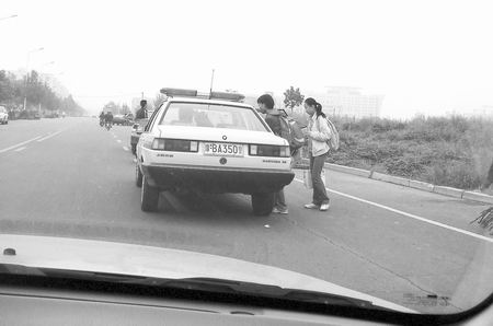 就在交警忙著疏通交通時(shí),一輛車牌號(hào)為豫OA028警的白色豐田轎車開了過來。這輛警車看起來非常新,車頂上方紅白藍(lán)相間的警燈很是耀眼,車身上醒目地印有“法院”字樣。