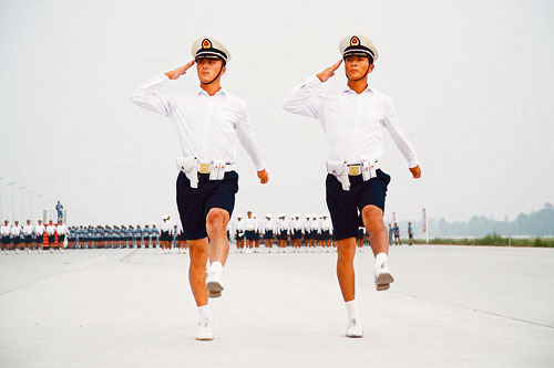 8月初的一天,沙河閱兵村地表溫度高達(dá)56攝氏度,晚上也悶熱異常。國慶閱兵徒步方隊(duì)指揮部指定,由海軍學(xué)員方隊(duì)為兄弟方隊(duì)作示范表演。當(dāng)郭海亮和馬培浩帶領(lǐng)著方隊(duì)穿過黑幕通過耀眼的燈區(qū)時(shí),方隊(duì)整齊如一、動(dòng)作剛勁飄逸,兩人的擺頭換臂動(dòng)作更是分毫不差。示范結(jié)束,觀摩的官兵擊掌稱贊,并對兩個(gè)領(lǐng)隊(duì)心心相通的默契豎起了大拇指。