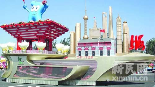 這輛名為“騰飛上!钡牟受囬L15米、寬6米,猶如一艘破浪前行的金色航船,船首是中共一大會(huì)址的建筑造型,背后是浦江兩岸的高樓大廈,后方為上海世博會(huì)中國館,上面有海寶揮舞國旗和鮮花,整個(gè)造型突出“上海背景,世博主題”,象征著上海乘風(fēng)破浪,朝著建設(shè)國際金融中心和國際航運(yùn)中心的目標(biāo)快速前進(jìn)。