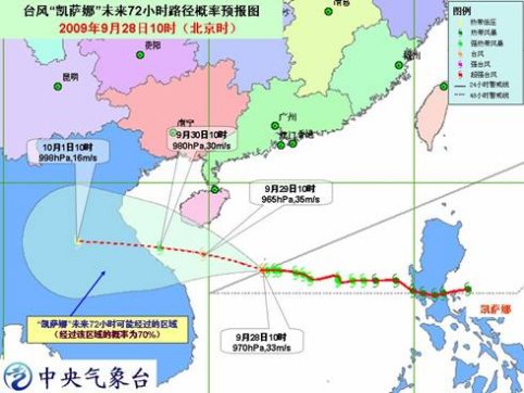 受“凱薩娜”及其外圍云系的影響, 28 日中午到 29 日中午 ,南海大部海面、北部灣海面、海南沿海、瓊州海峽將有 7~9 級大風,“凱薩娜”中心經(jīng)過的附近海面的風力將有 10~12 級大風,陣風可達 13~15 級;巴士海峽、巴林塘海峽、臺灣海峽、臺灣以東海面、廣東沿海、福建中南部沿海、廣西沿海也將有 6~7 級大風,陣風可達 8~9 級; 浙江東部沿海、福建東部沿海、臺灣南部、廣東南部、海南大部有大雨或暴雨,海南東部的局部地區(qū)有大暴雨。