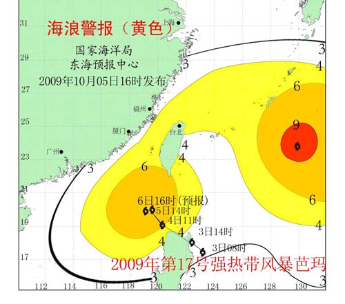 中新網(wǎng)10月5日電 國家海洋局東海預(yù)報中心根據(jù)《風(fēng)暴潮、海浪、海冰和海嘯災(zāi)害應(yīng)急預(yù)案》發(fā)布海浪Ⅲ級警報(黃色)。
