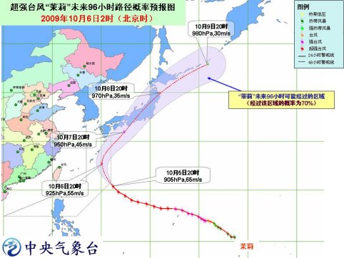 另外,今年第18號超強(qiáng)臺風(fēng)“茉莉”的中心6日2時位于日本沖繩島那霸東南方大約750公里的西北太平洋洋面上,就是北緯21.1度、東經(jīng)132.5度,中心附近最大風(fēng)力仍有17級以上(65米/秒),中心最低氣壓為905百帕。