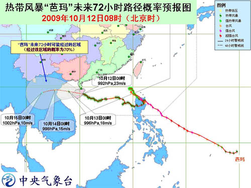 預計,“芭瑪”將以每小時15公里左右的速度繼續(xù)向西偏北方向移動,強度略有減弱,穿過海南島后,將于12日晚上到13日凌晨進入北部灣海面。