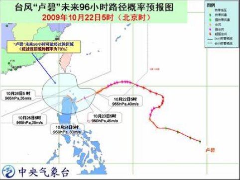 “盧碧”的中心22日5時(shí)位于菲律賓馬尼拉東北方大約650公里的西北太平洋洋面上,就是北緯19.1度、東經(jīng)125.1度,中心附近最大風(fēng)力有13級(40米/秒),中心最低氣壓為955百帕。