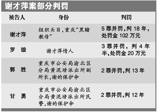 昨天上午,重慶市第五中級(jí)人民法院對(duì)謝才萍等22人“涉黑”案一審公開宣判。謝才萍犯組織、領(lǐng)導(dǎo)黑社會(huì)性質(zhì)組織罪、開設(shè)賭場(chǎng)罪等罪被判處有期徒刑18年,其余21名被告人分別被判處1至13年不等的有期徒刑。