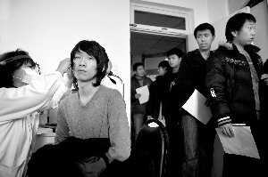 體檢內(nèi)容包括內(nèi)外科中的眼、耳、聽(tīng)力、身高、體重、心電圖、血尿,以及心理、毒品、艾滋病等多項(xiàng)檢查,在視力檢查室,等待檢查的應(yīng)屆學(xué)生已排起了長(zhǎng)隊(duì),主檢醫(yī)生對(duì)應(yīng)征青年視力的各項(xiàng)指標(biāo)進(jìn)行了檢查,包括近視、斜視、色盲等內(nèi)容。主檢醫(yī)生告訴記者,每年因視力不合格的占應(yīng)征者的30%左右。