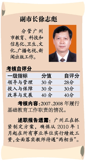 徐志彪在自評(píng)分說(shuō)明中,給自己這兩年的工作成績(jī)都打了98分,并在述職報(bào)告中表示,廣州正在抓緊制定方案,確保從2010年1月起在所有事業(yè)單位實(shí)行績(jī)效工資,全面落實(shí)教師待遇“兩相當(dāng)”。