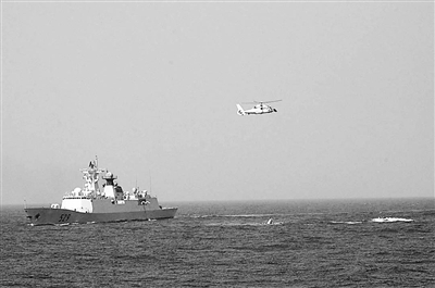 “白鷺洲”號(hào)油輪船員一面用消防水龍頭向接近的“海盜快艇”噴射高壓水流,一面向我海軍護(hù)航編隊(duì)求救!爸凵健迸炄缫粭l白色蛟龍,疾速向“海盜快艇”聚集海域駛來。我護(hù)航編隊(duì)直升機(jī)上特戰(zhàn)隊(duì)員接連對(duì)“海盜快艇”進(jìn)行攔阻射擊,并由“舟山”艦派出2艘艦載小艇對(duì)“海盜快艇”進(jìn)行登臨檢查!八{(lán)天戰(zhàn)鷹”和“銀色蛟龍”聯(lián)手驅(qū)散了船員心中的陰霾。