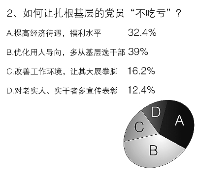基層比較艱苦,基層比較復雜,被問到“如何讓扎根基層的共產(chǎn)黨員‘吃苦不吃虧’?”時,39%的受訪者更關注用人導向問題,他們認為應該優(yōu)化用人導向,多從基層選拔領導干部;選擇提高經(jīng)濟待遇,福利水平的也占到了32.4%;值得注意的是,“更重視基層,改善工作環(huán)境,讓其大展拳腳”也受到關注,有16.2%的受訪者選擇了該選項。