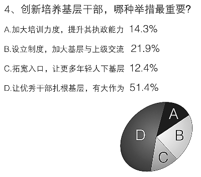 當被問到如何創(chuàng)新基層干部培養(yǎng)方式時,51.4%的受訪者選擇了“讓優(yōu)秀干部安心扎根基層,有大作為”,這說明基層雖苦,但在基層干部眼中卻是鍛煉干部最好的大學校,另外也表明了目前基層缺人才的現(xiàn)狀,熱切呼喚德才兼?zhèn)涞摹澳苋恕比ヮI導和管理。要解決這個問題,有21.9%的受訪者認為應該設立制度,加大基層與上級干部間交流。同時,12.4%的黨員干部把“拓寬入口,讓更多年輕人下基層”當作創(chuàng)新基層干部培養(yǎng)的首選。(梁昌杰、王慧)