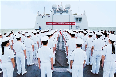綬帶映紅碧波,掌聲響徹大洋。今天(當(dāng)?shù)貢r(shí)間11月25日)下午4時(shí),中國(guó)海軍第三批護(hù)航編隊(duì)“火線(xiàn)立功和護(hù)航尖兵表彰大會(huì)”在“舟山”艦飛行甲板舉行。