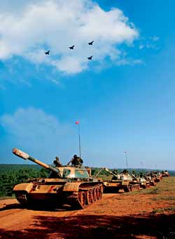 記者在演習(xí)現(xiàn)場(chǎng)看到,在某高地的爭(zhēng)奪戰(zhàn)中,紅藍(lán)雙方拼得異常激烈。拂曉剛過,“藍(lán)軍”15架飛機(jī)從多個(gè)方向同時(shí)出現(xiàn)在“紅軍”空域,準(zhǔn)備對(duì)“紅軍”目標(biāo)同時(shí)發(fā)起攻擊。“紅軍”毫不示弱,偵察飛機(jī)主動(dòng)出擊,出其不意地對(duì)敵情報(bào)預(yù)警系統(tǒng)實(shí)施欺騙性干擾,與此同時(shí),“紅軍”空中攔截兵力強(qiáng)行突防飛抵目標(biāo)上空,朝敵機(jī)猛撲過去,為奪取局部制空權(quán),與敵機(jī)展開了一場(chǎng)生死大戰(zhàn)。瞬間,方圓數(shù)百公里的戰(zhàn)場(chǎng)陡然升溫。爾后,“紅軍”空中轟炸機(jī)群多批次、多架次、不間斷對(duì)敵縱深目標(biāo)進(jìn)行持續(xù)轟炸,使敵指揮機(jī)構(gòu)、通信樞紐等重要目標(biāo)遭到癱瘓性打擊。