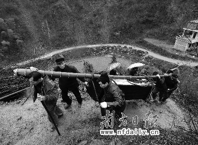 昨日下午,南方日報記者承租了4輛汽車,輾轉(zhuǎn)鄉(xiāng)村摩的,最后坐輪渡過廖家坪水庫,艱難進入山澗中的陰山排村時,村落的峽溪邊哀樂低回,不到1米寬的泥漿路上擺滿黑色棺材,哭聲震徹湖南安化高明鄉(xiāng)連綿的群山。一片青綠下,大山下白衣素裹。