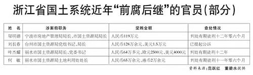 事實(shí)上,據(jù)統(tǒng)計(jì),不僅是浙江,近年來(lái)落馬的貪官不少都與房地產(chǎn)潛規(guī)則下的腐敗有關(guān),財(cái)政部原副部長(zhǎng)朱志剛,北京市原副市長(zhǎng)劉志華,山東省委原副書(shū)記、青島市委原書(shū)記杜世成,天津市政法委原副書(shū)記、天津市人民檢察院原檢察長(zhǎng)李寶金,湖南省郴州市原市委書(shū)記李大倫,安徽省原副省長(zhǎng)何閩旭,昆明市規(guī)劃局原局長(zhǎng)曾華,上海房地局原副局長(zhǎng)殷國(guó)元,江蘇省蘇州市原副市長(zhǎng)姜人杰,重慶市規(guī)劃局原局長(zhǎng)蔣勇,重慶市沙坪壩區(qū)原副區(qū)長(zhǎng)陳明,福州市國(guó)土資源局原局長(zhǎng)王炳毅,福州市倉(cāng)山區(qū)土地局原局長(zhǎng)李仲……都與房地產(chǎn)腐敗有關(guān)。