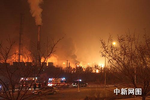 記者從現(xiàn)場看到,事故現(xiàn)場仍然在燃燒。在消防人員的搶救下,火勢比傍晚時(shí)分要小些。