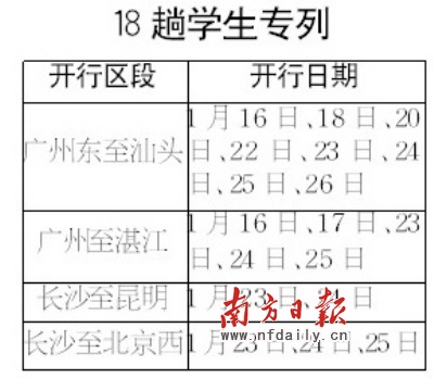 廣鐵集團(tuán)介紹,從1月16日開始,汕頭、湛江等地是廣州地區(qū)學(xué)生返鄉(xiāng)較為集中的方向,從1月23日起北京、昆明方向是長沙地區(qū)學(xué)生返鄉(xiāng)較為集中的方向,廣鐵集團(tuán)將開行18趟學(xué)生專列(具體開行日期見附表)。對其他出行方向的學(xué)生,鐵路部門將采取加掛車廂和優(yōu)先學(xué)生票預(yù)售等措施。