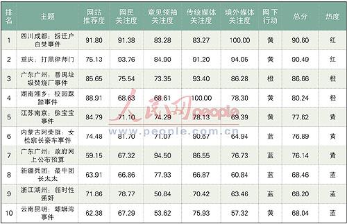說(shuō)明:表中總分依據(jù)網(wǎng)民關(guān)注度、傳統(tǒng)媒體報(bào)道、網(wǎng)站推薦度、意見(jiàn)領(lǐng)袖關(guān)注度、境外媒體關(guān)注度、網(wǎng)下行動(dòng)六項(xiàng)數(shù)據(jù)作加權(quán)處理后統(tǒng)計(jì)所得。各項(xiàng)權(quán)重分別為:網(wǎng)民關(guān)注30%、傳統(tǒng)媒體報(bào)道15%、網(wǎng)站推薦度10%、意見(jiàn)領(lǐng)袖關(guān)注度20%、境外媒體關(guān)注度10%、網(wǎng)下行動(dòng)15%。依據(jù)總分將輿情熱度劃分為紅、橙、黃、藍(lán)四個(gè)級(jí)別,熱度相應(yīng)由高至低。其中90.00分以上輿情熱度為紅色,事件最受輿論關(guān)注,80.00—89.99分輿情熱度為橙色,70.00—79.99分輿情熱度為黃色,70.00分以下輿情熱度為藍(lán)色,事件關(guān)注度相對(duì)最低。