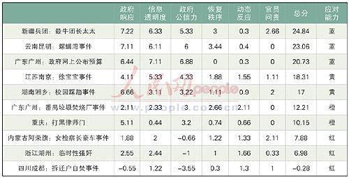 人民網(wǎng)輿情監(jiān)測(cè)室從100多家境內(nèi)外報(bào)刊的新聞報(bào)道和評(píng)論,8家門(mén)戶網(wǎng)站的新聞跟帖,約30家論壇/BBS,400余名網(wǎng)絡(luò)“意見(jiàn)領(lǐng)袖”博客,以及微博客、QQ群和播客網(wǎng)站中,梳理出了2009年第四季度十件“輿情熱點(diǎn)事件”,并按照“政府響應(yīng)、信息透明度、政府公信力”3個(gè)常規(guī)指標(biāo),以及“恢復(fù)秩序、動(dòng)態(tài)反應(yīng)、官員問(wèn)責(zé)”3個(gè)特殊指標(biāo),對(duì)2009年第四季度十件“輿情熱點(diǎn)事件”的政府應(yīng)對(duì)、處置能力做出了評(píng)估,結(jié)論是: