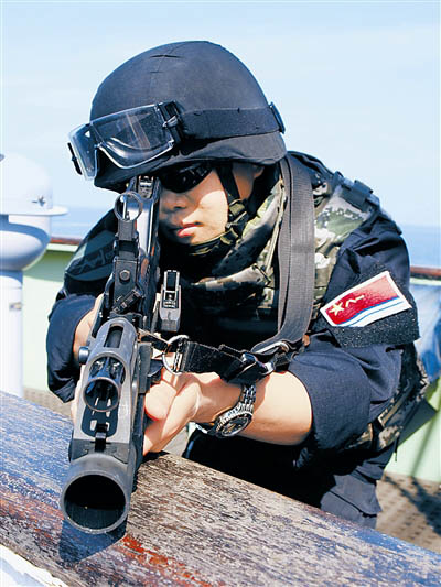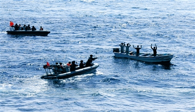 12時28分,巢湖艦在艦載直升機的引導下鎖定了正在轉向“鴻達號”商船的疑似海盜快艇。在發(fā)射3枚信號彈予以警告后,疑似海盜快艇被迫停車,隨后趕到的馬鞍山艦迅速派出2艘小艇靠近,特戰(zhàn)隊員將其驅離。