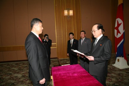 劉曉明大使夫人胡平華及中國(guó)駐朝鮮使館外交官、朝鮮最高人民會(huì)議常任委員會(huì)對(duì)外事業(yè)部長(zhǎng)林賢輔,外務(wù)省副相金亨俊等參加授勛儀式。