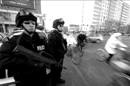 昨天上午,記者在西單文化廣場前看到,一輛武裝處突車閃爍著警燈?吭诼放裕瑑擅碇鲬(zhàn)服的特警隊員全副武裝,警覺地注視著長安街附近的人流和車流。
