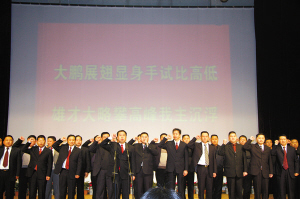在武隆縣委常委楊國權(quán)、吳成武、李成群等上臺之后,其他縣領(lǐng)導、部門領(lǐng)導也相繼走上前臺,舉起右拳立下誓言。因為過于緊張,平常舉止大方的“一把手”們還鬧出不少笑話。有的變得結(jié)巴,有的忘了事先想好的誓詞,有的忘了舉起右手,還有人忘了報自己姓名。但不管過程如何,所有宣誓人最后一句話都離不開“如果完不成任務(wù),我主動辭職”。