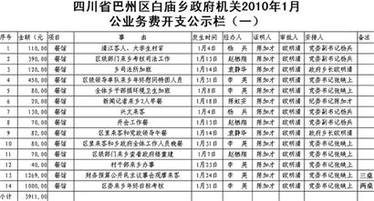 帖子內(nèi)名為《四川省巴州區(qū)白廟鄉(xiāng)政府機(jī)關(guān)2010年1月公業(yè)務(wù)費(fèi)開支公示》的表格顯示,1月份,鄉(xiāng)政府支出公業(yè)務(wù)費(fèi)44筆,共8240.5元,其中最大的一筆開支是,1月24日招待“財(cái)務(wù)預(yù)算公開民主議事會(huì)觀摩來客”,請客三桌,花費(fèi)1269元,最小的一筆開支僅為“購買信紙”,花費(fèi)1.5元。