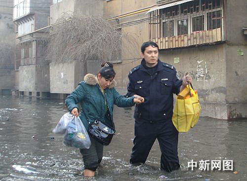 大量的融雪性洪水向倉房溝村一帶低洼處涌積,致使土柸結(jié)構(gòu)的居民住房被洪水浸泡,有垮塌之險。另一處的大量洪水涌入近處一棟居民樓,民警立即組織警力進入樓內(nèi)進行施救,挨家挨戶動員居民撤離住所,并攜老扶幼將婦女兒童帶離危險地帶。