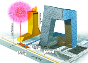2008年12月下旬,沙鵬、李小華、宋哲元、劉發(fā)國4人前往央視工地,確定在央視主樓、配樓間的通道燃放,具體位置在通道西頭,緊挨著三環(huán)輔路。隨后劉發(fā)國邀請沙鵬、李小華前往廊坊國際酒店看了一場30萬元的焰火表演。