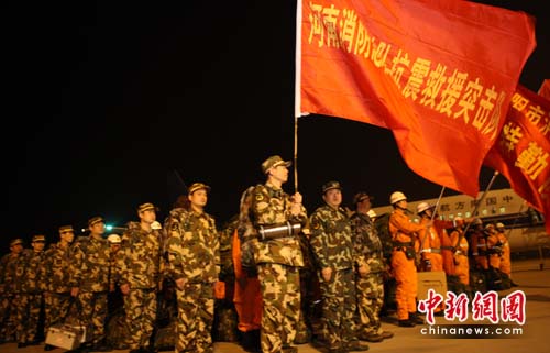 中新網(wǎng)4月15日電(王登峰 王志軍)今日凌晨3時(shí),按照公安部命令,河南省消防總隊(duì)跨區(qū)域應(yīng)急救援隊(duì)在總隊(duì)長夏夕嵐帶領(lǐng)下,從鄭州市新鄭機(jī)場乘飛機(jī)趕赴青海玉樹縣災(zāi)區(qū)抗震救災(zāi)。