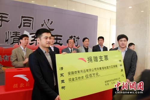 中新網(wǎng)晉江4月19日電(孫虹)19日,安踏體育用品有限公司透過(guò)晉江慈善總會(huì)向青海玉樹(shù)地震災(zāi)區(qū)捐贈(zèng)200萬(wàn)元現(xiàn)金與價(jià)值300萬(wàn)的賑災(zāi)物資,共計(jì)500萬(wàn)元人民幣。