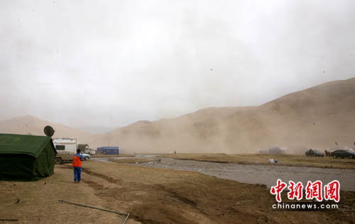 中新網青海玉樹4月19日電(記者劉忠俊)19日,青海玉樹地震災區(qū)的天氣可以說是一天多變,大風狂暴吹起地上塵土,天地一片昏暗。不到幾分鐘又下小雨,過后又出大太陽。大風造成災民以及救援隊的一些帳篷被吹倒,一醫(yī)療點的兩帳篷被大風吹到20米外,造成帳篷里的兩位醫(yī)生和一名記者受傷,其中記者傷得不輕。