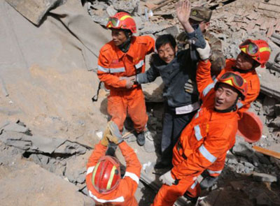 國家救援隊在到達(dá)玉樹機(jī)場后,救援隊員火速前往受災(zāi)最重的玉樹縣城結(jié)古鎮(zhèn)。全體救援隊員挑燈夜戰(zhàn),齊心協(xié)力營救出2名幸存者。雖初戰(zhàn)告捷,但救援隊員不敢絲毫松懈,因為廢墟還有更多生命等待我們。只要有一線希望,我們就會盡百倍努力,“不拋棄,不放棄”。
