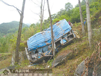 東蘭訊 4月22日上午9時(shí)許,一輛由大化瑤族自治縣七百弄鄉(xiāng)開往河池市的客運(yùn)中巴車,在途經(jīng)東蘭縣花香鄉(xiāng)干來村時(shí)突發(fā)機(jī)械故障,導(dǎo)致車輛滾下90米長(zhǎng)陡坡(垂直高度40米)。事故造成車上7名乘客先后死亡,35人不同程度受傷。