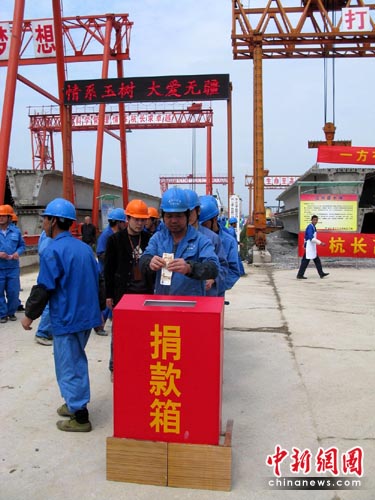 據(jù)杭州市高速公路管理局局長趙益民介紹,青海玉樹地震災(zāi)情發(fā)生后,杭長高速公路杭州段的建設(shè)者們,迅速自發(fā)地開展捐款活動。據(jù)悉,昨天,杭長高速共有10個施工現(xiàn)場舉行了“心系玉樹獻愛心”的捐款活動,近千名民工參加。