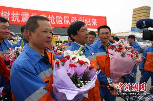 中新網(wǎng)成都4月26日電(記者劉忠俊)26日,國(guó)家電網(wǎng)四川省電力公司電力抗震救災(zāi)搶險(xiǎn)隊(duì)安全從地震災(zāi)區(qū)玉樹返蓉。該支抗震救災(zāi)搶險(xiǎn)隊(duì)為玉樹災(zāi)區(qū)送去了發(fā)電機(jī)、發(fā)電車以及電力搶險(xiǎn)設(shè)備和救援物資,為玉樹災(zāi)區(qū)災(zāi)民安置區(qū)、學(xué)校復(fù)課提供了充足的電力保障。