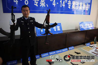 B——4月14日,長沙市公安局雨花分局金桃派出所巡防隊員查獲8支非法販運的槍支,長沙警方在浙江、上海、云南、廣東公安機關(guān)的協(xié)作下,破獲了一起從境外向“長三角”地區(qū)販運槍支的大案。此案繳獲包括殺傷力極大的M16、AK47突擊步槍在內(nèi)的各種軍用槍支13支、子彈305發(fā),抓獲犯罪嫌疑人7人。