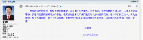 張春賢在帖中說:親愛的網(wǎng)友朋友們,根據(jù)黨中央的決定,我將離開為之奮斗、為之感動、為之自豪的三湘大地,心情久久難以平靜。我謹向親愛的湖南網(wǎng)友們告別,也真誠地感謝幾年來網(wǎng)友們對我各方面的支持。在與你們的互動中,使我快捷地了解了民情民意,集中了民眾智慧,更感受到網(wǎng)友們的家國情懷和良好素質(zhì)。謹祝愿網(wǎng)友們幸福、快樂、安康!