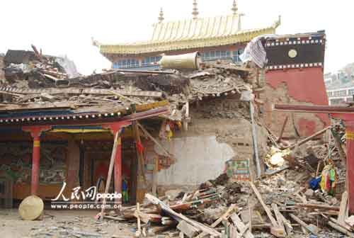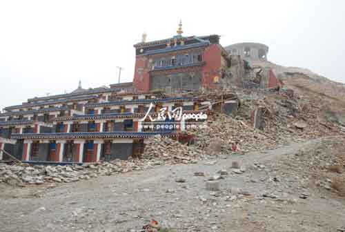 距結(jié)古鎮(zhèn)約20公里的禪古寺是該地區(qū)噶舉派最大的寺院,也是地震中損毀最嚴(yán)重的寺廟,3個(gè)主殿堂損毀兩座,經(jīng)堂全部倒塌,有260間僧房與兩個(gè)閉關(guān)等也被全部毀壞,更重要的是還有大量佛教用品和珍貴文物埋在廢墟下。