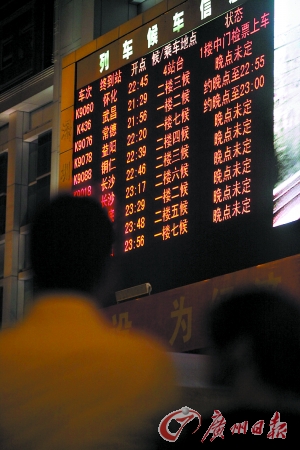 “已經(jīng)等了3個多小時了。我是請假陪女兒去旅游的,現(xiàn)在多掃興。”鄔女士在電話中對記者抱怨。鄔女士原本打算乘坐晚上8時05分的廣州至張家界列車。7時許,她和女兒趕至候車大廳,隨即被告知受災(zāi)情影響,列車晚點了。鐵路工作人員告訴乘客,可以全額退票,也可換第二日的票。“當時很多人涌去了退票窗口,上千人擠在一起,很壯觀,跟春運一樣。由于退票換票的人實在太多,與此同時,廣場大屏幕開始滾動顯示受到影響晚點的列車。晚上9時許,鄔女士決定退票,被鐵路工作人員告知,她們乘坐的列車可能今晚就會開出!拔沂翘匾庹埣倥闩畠喝ヂ糜蔚,今晚能開車那我肯定不愿意退票了!庇谑,鄔女士母女決定繼續(xù)等。但直至晚上10時,她們還是沒能上車。此時,由于陸續(xù)有列車開車,廣場上的人流少了一半。盡管郁悶,但鄔女士還是顯得很有耐性。“不過有人開始發(fā)脾氣扔行李了!编w女士告訴記者。