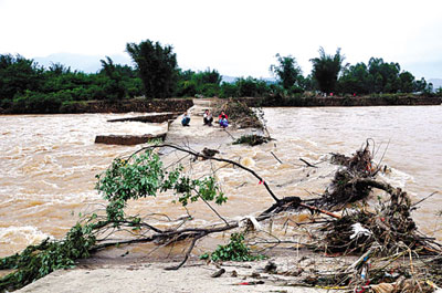 6日下午18時左右,位于乳源境內(nèi)的國道323線K426+360處大型涵洞被洪水沖毀,造成路面出現(xiàn)一個14.5米深的大洞,被毀路基長90米、路面1000平方米、擋土墻2500立方米,致使交通完全中斷。公路部門已在現(xiàn)場設(shè)置了安全警示標志,并在可繞行路口設(shè)置指示標牌,安排人員疏導(dǎo)過往車輛改道行駛。搶險隊經(jīng)研究決定:先在該路段被沖毀的橋涵缺口旁埋設(shè)一條約2米長的涵管,并力爭用三天時間完成便道的鋪設(shè)工作,解決暫時的通車問題;待洪水過后,再在損毀路段新架一座橋梁徹底解決此處通車問題。