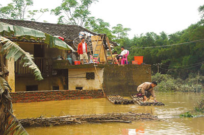 同為翁城鎮(zhèn)的富陂村由于多是土磚房,受災(zāi)更為嚴重。走進村子,幾乎找不到幾間完整的房子,村民們忙著從斷壁殘垣中找尋著能用的衣物和化肥。富陂村第七小組的村民告訴記者,該組250間房80%都已倒塌,100多村民無家可歸。前天下午,洪水來的時候,多數(shù)村民們已經(jīng)在干部們的勸說下安全撤離,然而,仍有50名群眾被困水中。由于沒有沖鋒舟,鄉(xiāng)鎮(zhèn)干部只能找來竹子扎成竹排來回救人。水流太急,竹排不好使,干部們又找來鐵船,鐵船不聽使喚,干部們只得趟著淹到脖子的洪水拖著鐵船搶救剩下的群眾。