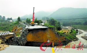 本報韶關(guān)訊(記者卜瑜 通訊員賴志坡、蔡明清攝影報道) 位于乳源境內(nèi)的國道323線K426+360處大型涵洞被洪水沖毀。路面出現(xiàn)深達14.5米的大洞(如圖),被毀路基長90米、路面面積1000平方米,交通中斷。韶關(guān)市政府昨天調(diào)集100多名工人和10多臺大型機械日夜搶修,有望今天恢復(fù)通行。