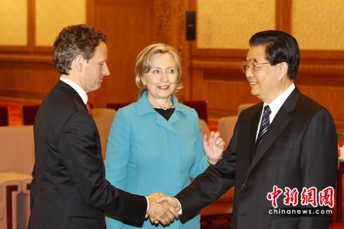 中新網(wǎng)北京5月25日電 (記者 張朔)中國(guó)國(guó)家主席胡錦濤25日下午在人民大會(huì)堂會(huì)見(jiàn)來(lái)華出席第二輪中美戰(zhàn)略與經(jīng)濟(jì)對(duì)話的美國(guó)國(guó)務(wù)卿克林頓和財(cái)長(zhǎng)蓋特納以及美方部分部長(zhǎng)。