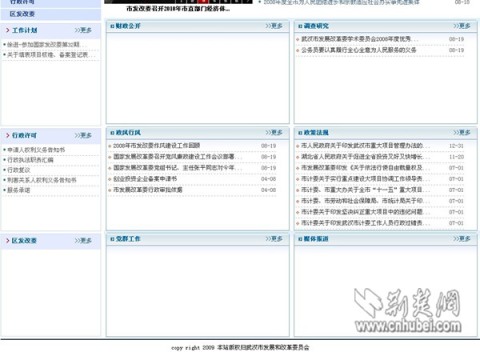 記者隨即登錄武漢市發(fā)改委政務(wù)公開網(wǎng)站。在該網(wǎng)站首頁記者發(fā)現(xiàn),除“來信選登”一欄開天窗以外,其它欄目的信息更新還比較及時。可當(dāng)記者點擊進入子欄目時,就不是那么回事了!俺R妴栴}匯總”、“表格下載”、“項目稽查”、“財政公開”等十幾個子欄目,均無任何內(nèi)容,只有大片空白。此外,在市民具體辦事的“業(yè)務(wù)專欄”欄目下,24個子欄目內(nèi)容驚人地一致,幾乎全是空白框架。